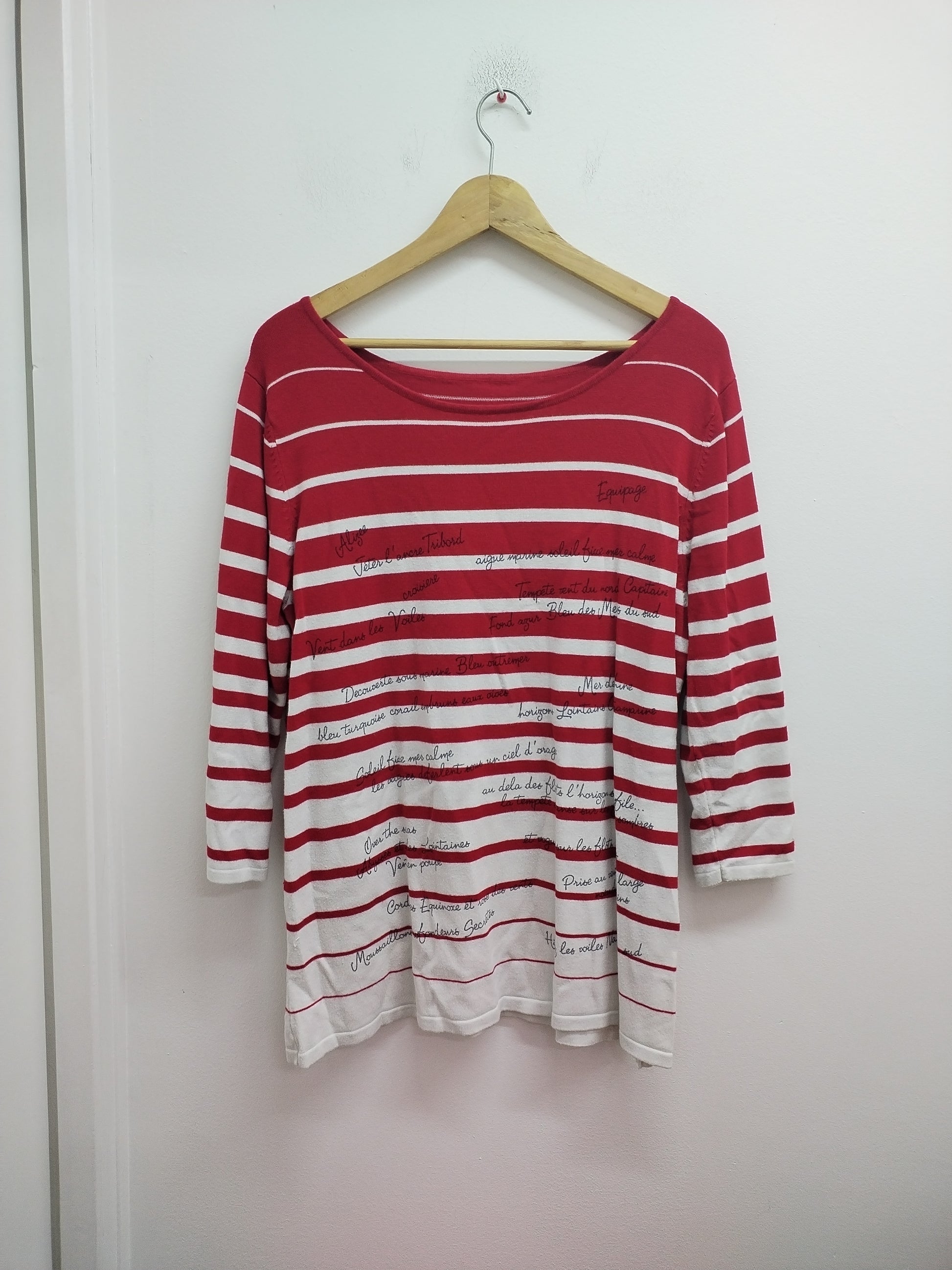 Pull fin manches 3/4 rayé rouge et blanc avec écriture Taille L