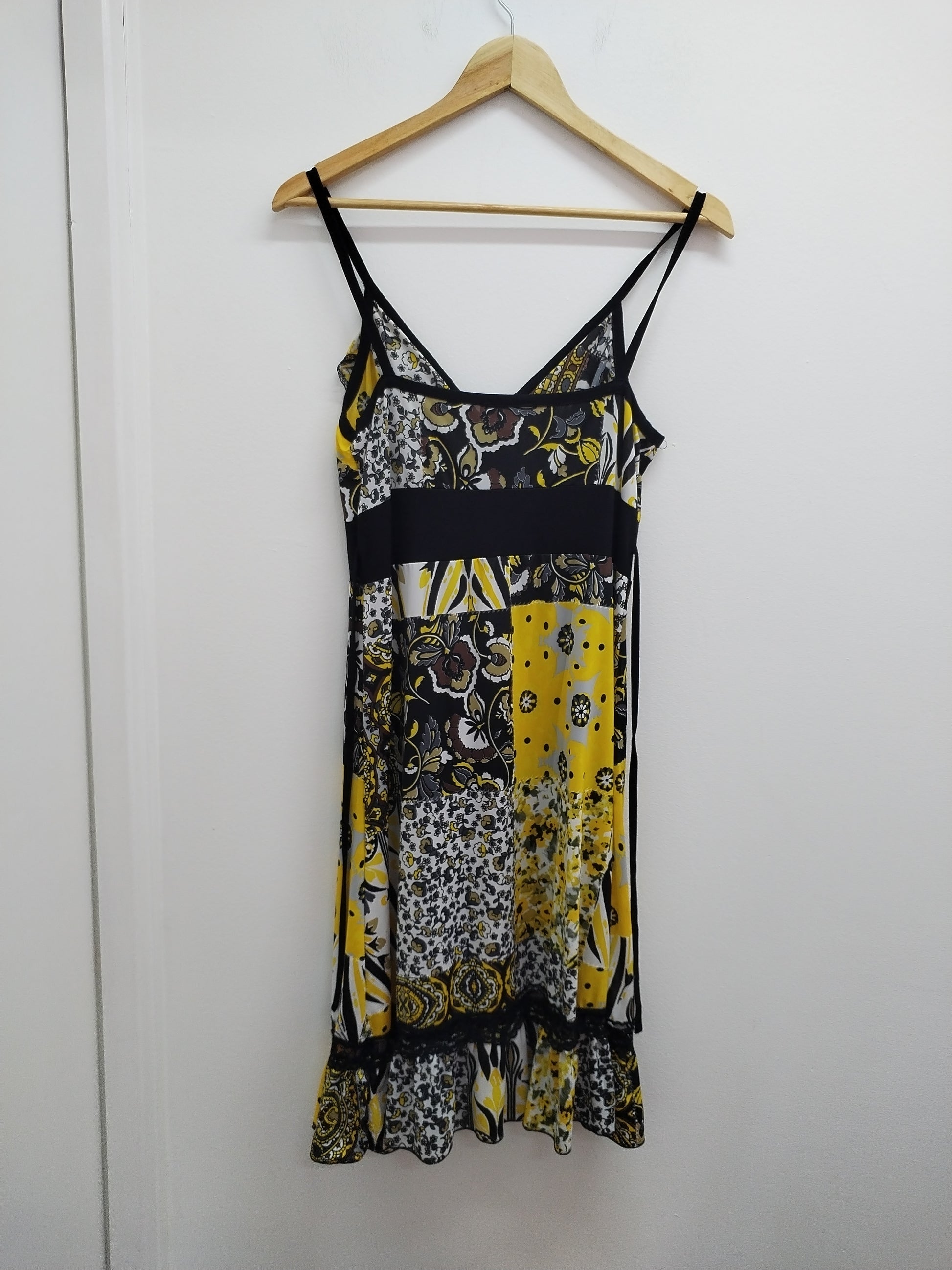 Robe à bretelles Jus d'Orange noire et imprimé blanc et jaune Taille M